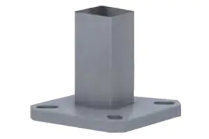 4-bolt steel plate base flange of fabricated carbon steel conforming to ASTM A36 with a minimum yield strength of 36,000 PSI, with a 2-piece base cover and attaching hardware.
